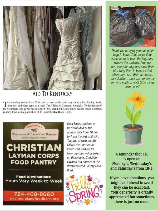 Bonnie’s Place, named for deceased volunteer, Bonnie Barnhart, is our Food Pantry where food is distributed the FIRST and THIRD Tuesday of each month. We are a partner of the Westmoreland County Food Bank.